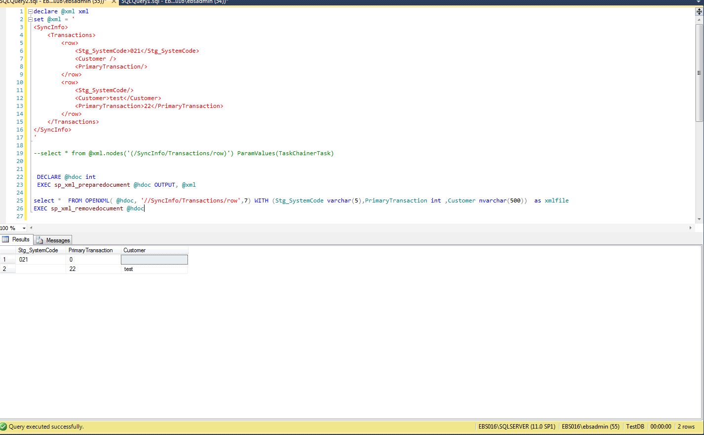 select * FROM OPENXML( @hdoc, '//SyncInfo/Transactions/row',7) WITH (Stg_SystemCode varchar(5),PrimaryTransaction int ,Customer nvarchar(500)) as xmlfile